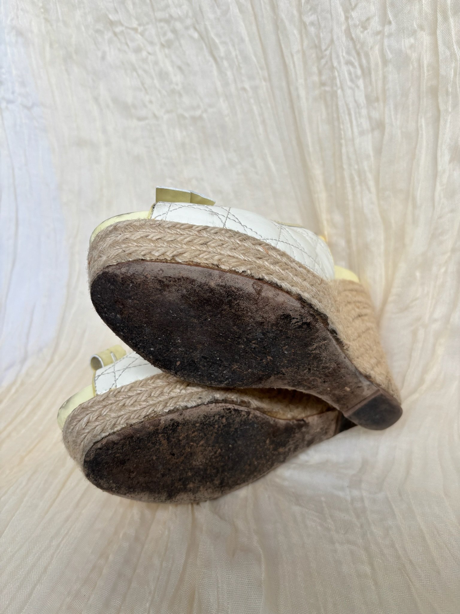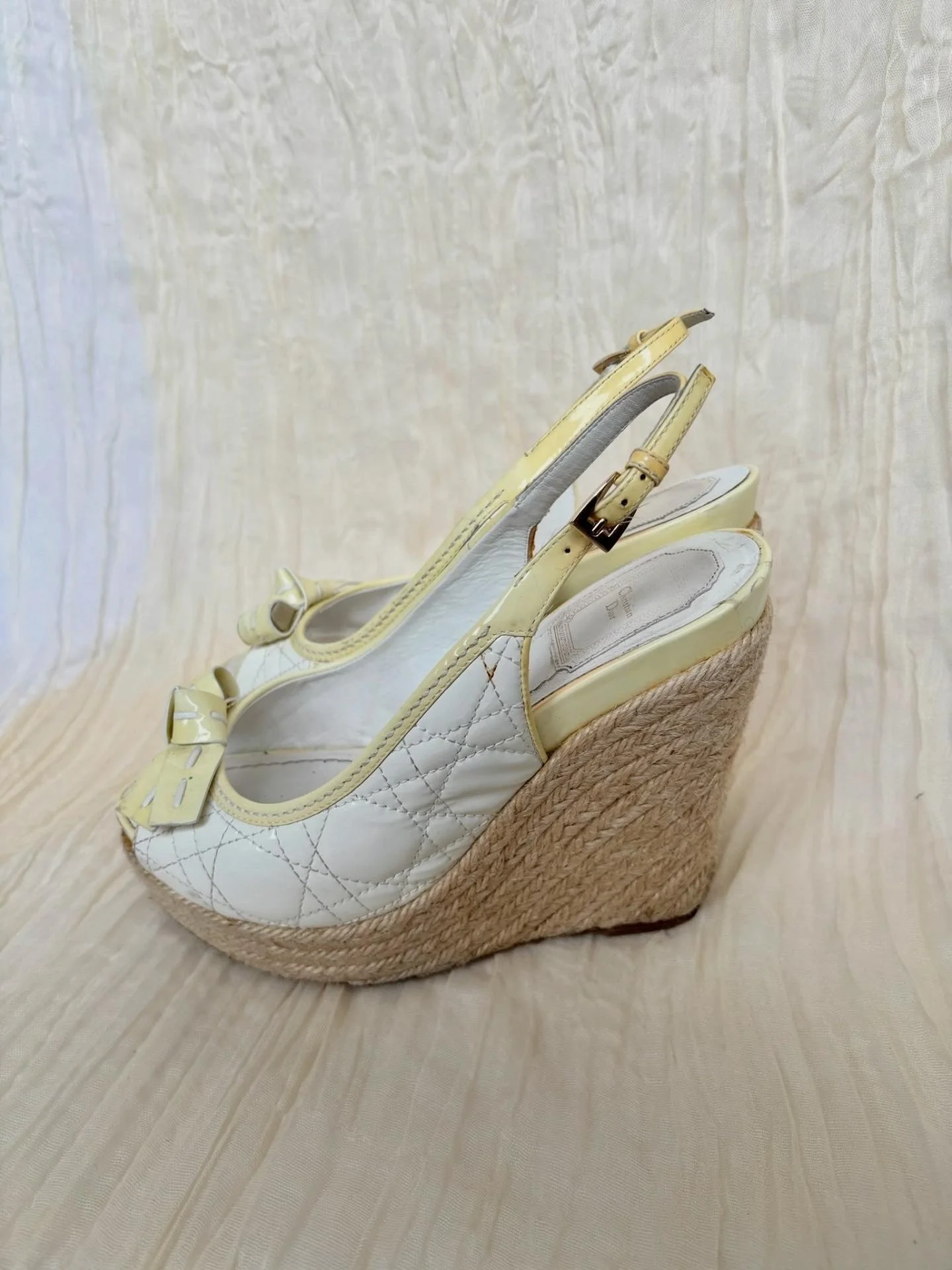 Charming Dior wedges in pale yellow patent leather with quilted stitching and a raffia espadrille platform. Features a delicate bow detail and peep-toe slingback design — perfect for summer styling with a soft vintage flair.